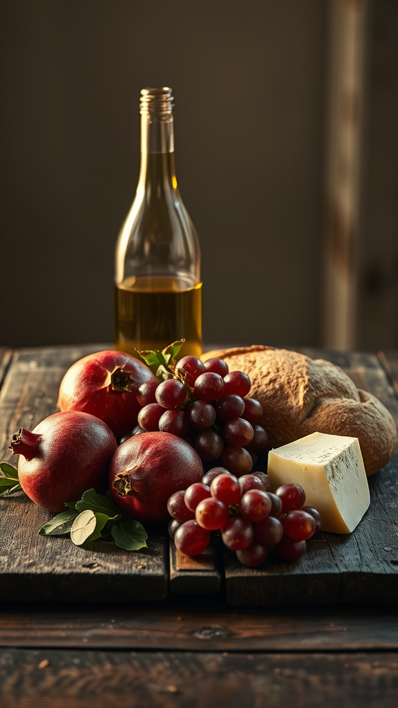 A serene still life captures a selection of sumptuous fruits, including a ripe pomegranate and a cluster of grapes, arranged alongside a rustic loaf of bread. An empty wine bottle stands tall, its glass reflecting the warm glow of the super soft light. Beside it, a wedge of creamy cheese rests invitingly on an antique, weathered kitchen table. The scene is enveloped in a rich chiaroscuro effect, reminiscent of a classic Rembrandt painting, with shadows that dance gently across the textured wood and imbue the composition with a timeless elegance.