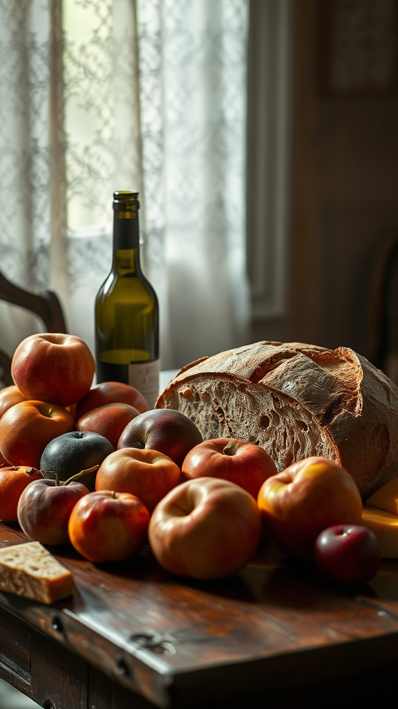 A serene still life featuring an assortment of large, ripe fruits and a crusty loaf of bread, accompanied by a half-empty wine bottle and a wedge of aged cheese, all elegantly arranged on an ancient wooden kitchen table. The setting is bathed in a gentle, diffused light reminiscent of a Rembrandt painting, casting soft, luscious shadows that accentuate the rich textures and deep colors of the scene. In the background, a faint glimpse of a vintage lace curtain adds a touch of nostalgia to the timeless composition.
