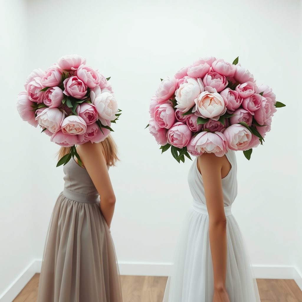 A serene white minimalist room, almost empty, featuring two girls in elegant dresses, their heads entirely obscured by lush clusters of blooming pink peonies. This scene captured in high detail, highlighting the delicate textures and vibrant hues of the flowers, set in a balanced 4:5 aspect ratio format. Subtle changes in their dress patterns introduce a soft contrast, allowing the floral headpieces to stand out vividly against the tranquil backdrop.