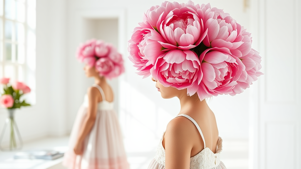 A serene white minimalist room, featuring a young girl in an elegant dress with her head fully adorned in lush pink peonies. The space is bathed in soft, natural light, enhancing the delicate textures of the flowers and the simplicity of the surroundings. Two high-detail photos capture the scene, focusing on the contrast between the vibrant peonies and the gentle, neutral tones of the room, evoking a sense of tranquility and ethereal beauty.