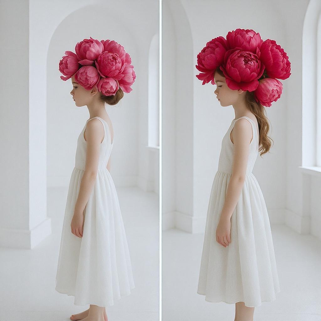 A serene white minimalist room, featuring two girls wearing elegant dresses, their heads artistically adorned with lush pink peonies, captured in two high-detail photographs. The ambiance embodies tranquility and delicate beauty, with the floral arrangements adding a vibrant touch to the serene backdrop, all within an elevated 4:5 aspect ratio.