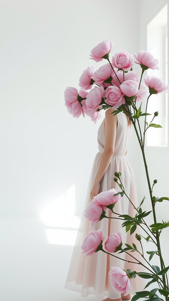 A serene white minimalist room with bare walls features a girl in a flowing dress, her head entirely obscured by an arrangement of blooming pink peonies; another image shows the same room and girl, now with a gentle breeze causing the peonies to sway slightly, capturing intricate details in high resolution -- proportions 4:5.