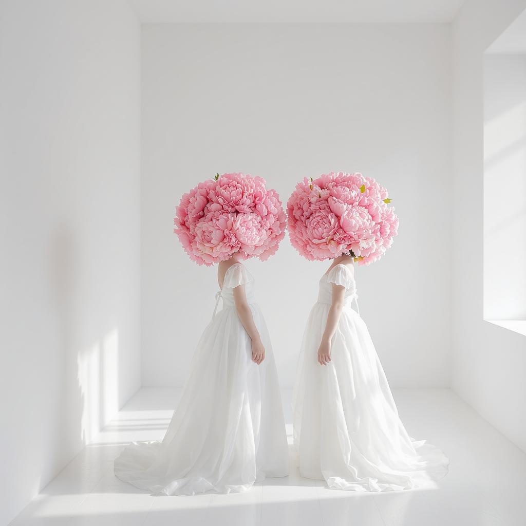 A serene white minimalist room with only essential elements, softly bathed in natural light. In the center, two girls each wearing elegant dresses stand gracefully, their heads completely adorned and enveloped with lush pink peonies. High-definition, meticulous detailing captures the intricate layers of the petals and the textures of the dresses. The overall ambiance exudes tranquility and ethereal beauty, maintaining a harmonious balance within a 4:5 aspect ratio frame.
