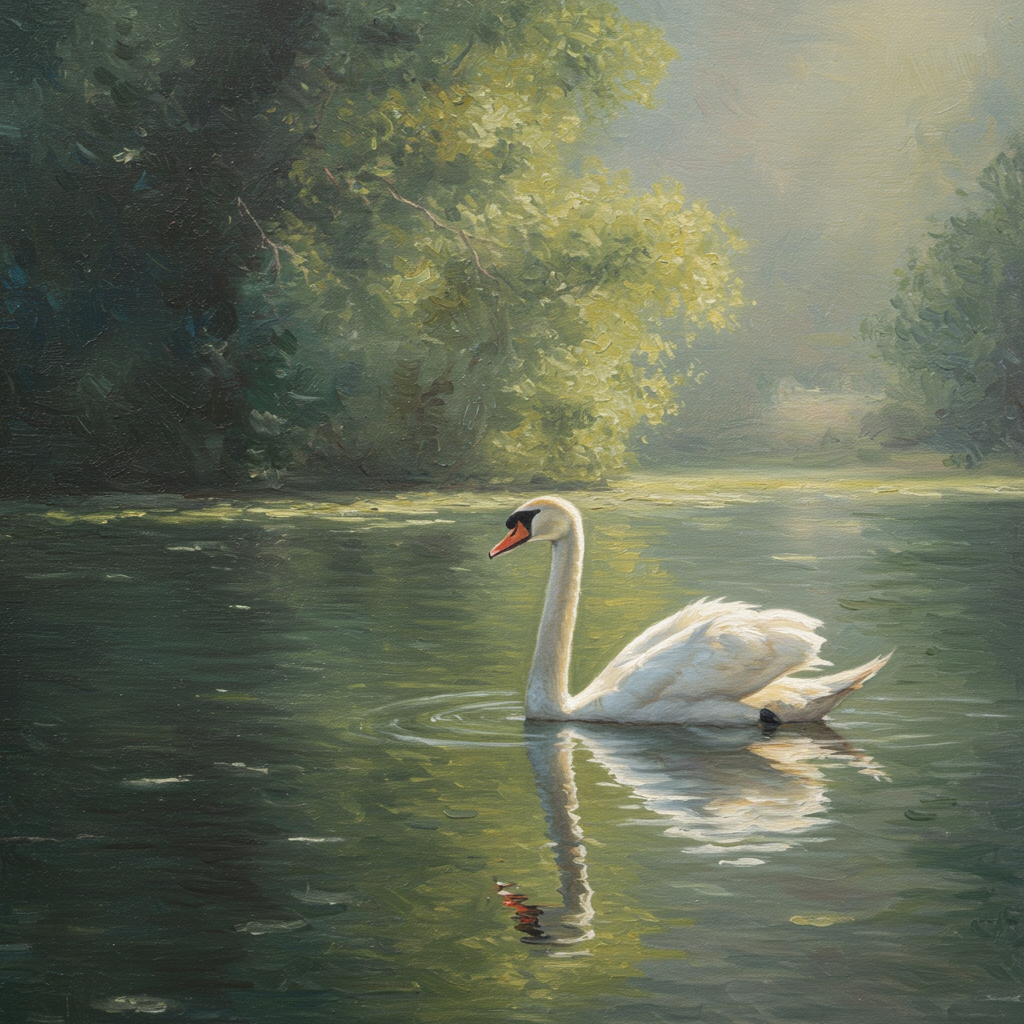 A serene white swan elegantly gliding across a tranquil lake, depicted in an impressionist style reminiscent of Adolf Wölfli. The scene captures the swan’s graceful movement, emphasized by a soft summer glow that envelops the setting. The composition has a dream-like quality, portraying the swan’s effortless glide as if winning an ethereal award in a picturesque summer landscape. The artwork is vertical in orientation, offering a raw and richly textured interpretation that exudes internal warmth and peace.
