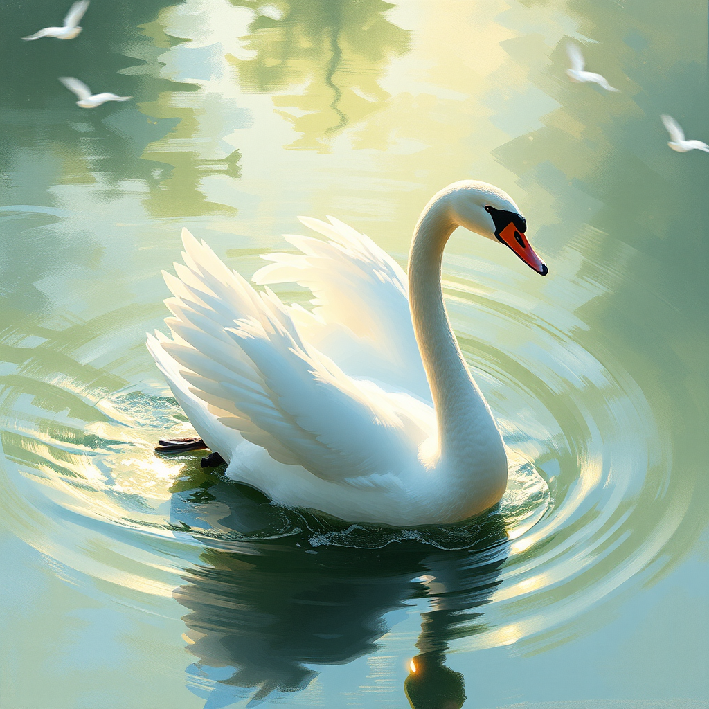 A serene white swan in motion, inspired by impressionist art with an influence of Adolf Wölfli, effortlessly gliding through a summer scene. Capturing an ethereal and dreamy quality with an internal glow, the swan exudes grace. The scene evokes a sense of tranquility and beauty, reminiscent of an award-winning moment, with soft brush strokes and a raw, yet delicate style, in a vertical 9:16 aspect ratio, maintaining high quality and vivid details.