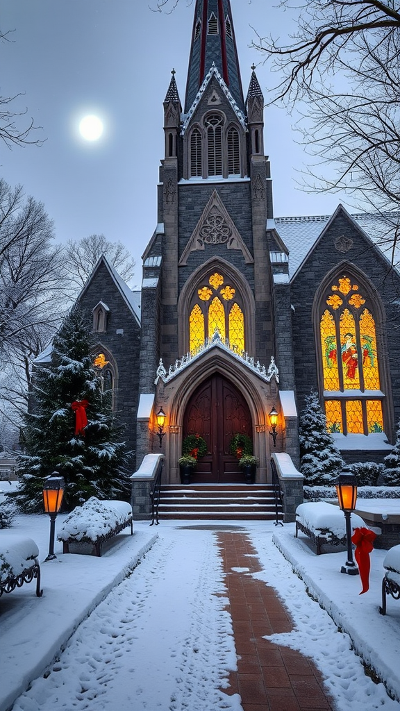 A serene winter scene envelops the majestic Kirk in the Hills Presbyterian Church in Bloomfield Hills, Michigan, where fresh snow drapes the gothic-inspired architecture, casting a peaceful glow in the moonlight. Icicles glisten along the intricate stone carvings and towering spire, while a gentle snowfall blankets the pristine grounds. Warm, inviting light spills softly through grand stained glass windows, creating colorful reflections on the snow. Evergreen wreaths adorned with crimson bows embellish the ornate entrance doors, and a path lined with festive lanterns leads to the heart of this historic sanctuary. The tranquil yet luxurious ambiance captures the essence of a rustic Christmas, inviting all to celebrate the season's peace and joy.