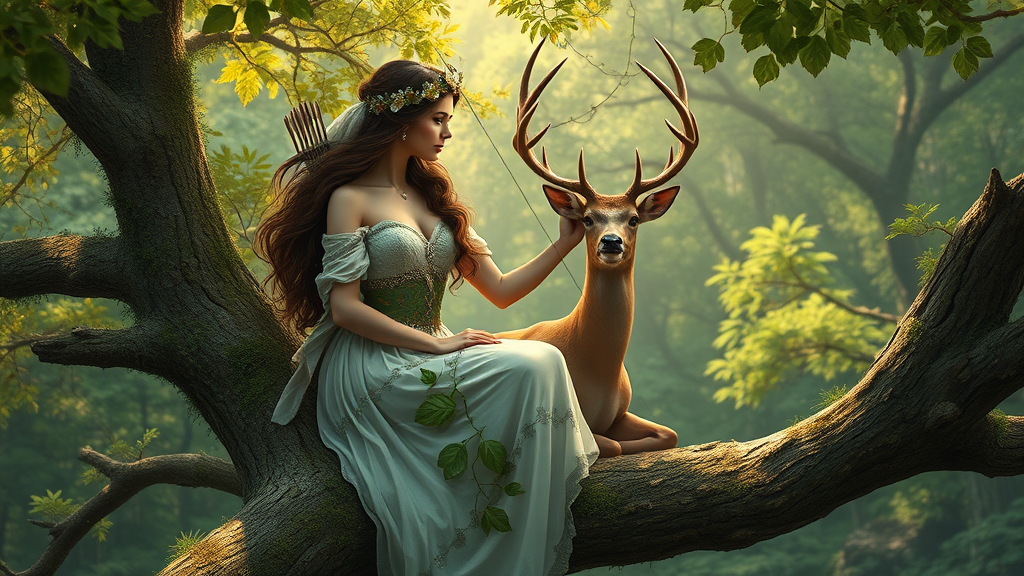 A serene woman sits gracefully on a high tree branch, her gaze meeting that of a majestic deer standing beside her. She embodies the essence of the hunt with an ethereal presence; a female forest archer elegantly poised in the lush canopy. This goddess of the woods exudes an aura that blends seamlessly with the vibrant tapestry of the forest. Her attire is adorned with leaves and subtle, shimmering accents, capturing the essence of a forest hunter lady in a beautiful, realistic fantasy illustration. Her features reflect the delicate power and beauty of a maiden while suggesting the wisdom and authority of a fey queen reigning over the summer forest. This compelling scene, inspired by the styles of graphic artist Magali Villeneuve, is an awe-inspiring portrayal of a goddess of the forest in a mesmerizing, realistic fantasy artwork.