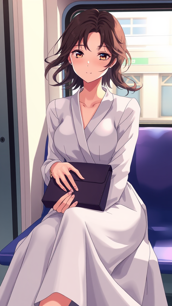 A serene woman sits gracefully on a train seat, clutching a stylish purse. The scene is rendered in anime art style, capturing the elegance of aestheticism with a careful blend of vibrant colors. The background is detailed, showing the world passing by through the train window with subtle reflections. Her expression is calm, and her hair flows naturally, enhancing the sense of motion. The overall atmosphere is soothing and harmonious, free from distortions or disfigurements, celebrating the beauty in everyday moments with clarity and artistic finesse.
