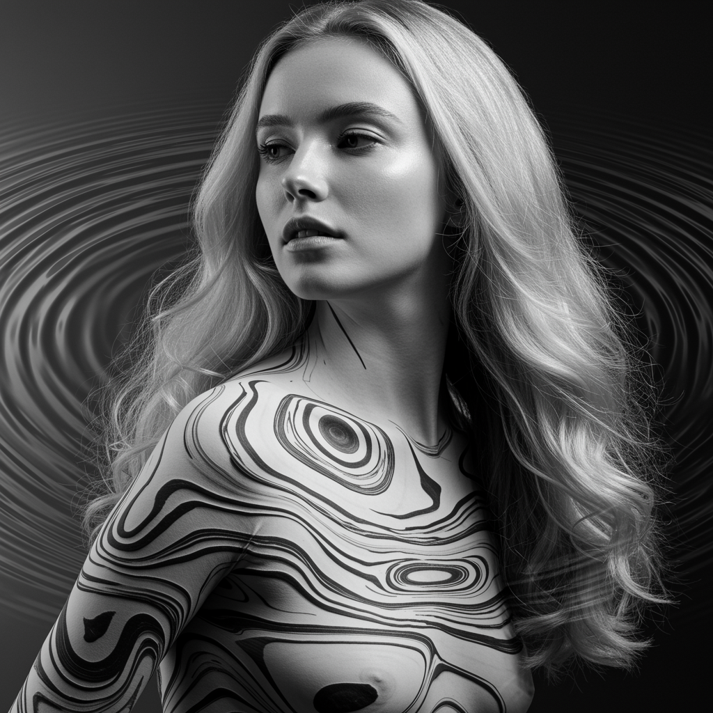 A serene woman with cascading blonde hair and luminous fair skin gazes thoughtfully to the side. She is adorned in a sleek, white garment adorned with intricate black lines forming an abstract pattern reminiscent of flowing water currents. The monochrome backdrop echoes this ripple effect, enhancing the visual harmony between her attire and surroundings. This scene exudes a sophisticated elegance, with a dynamic graphical quality that captures the fluidity of movement and design.