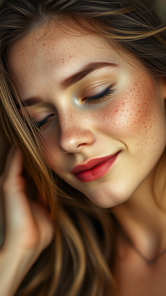 A serene woman with freckles and a gentle smile, embodying naturecore with a calming aura. Her essence radiates intense energy, captured in a photography style reminiscent of provia film. The image highlights her figurative precision and exudes a sleepycore vibe through her gentle, peaceful expressions, all set against a natural backdrop that enhances her tranquil presence.