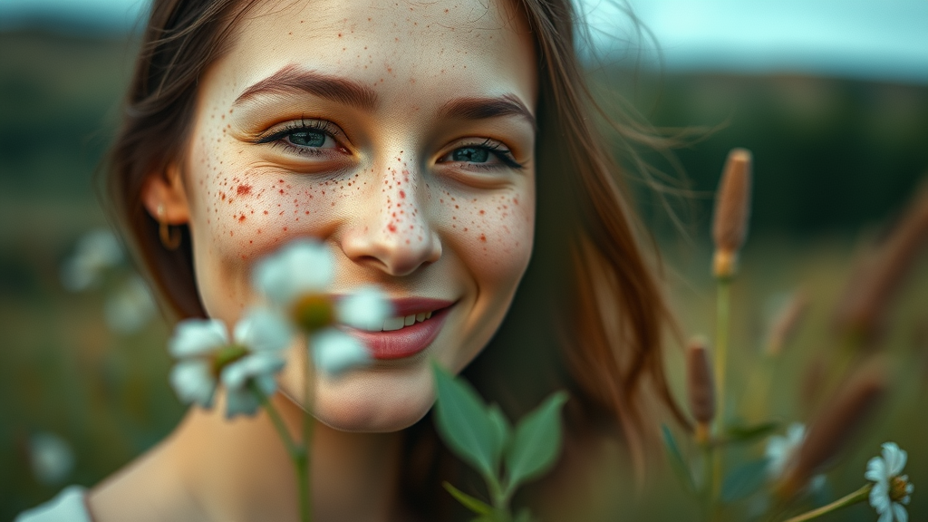 A serene woman with freckles smiles gently, embodying a calming aura and a connection to naturecore, her presence infused with intense and vibrant energy. Captured with a Provia-like clarity, the scene showcases figurative precision and sleepycore tones, emphasizing her gentle expression amidst a tranquil landscape.