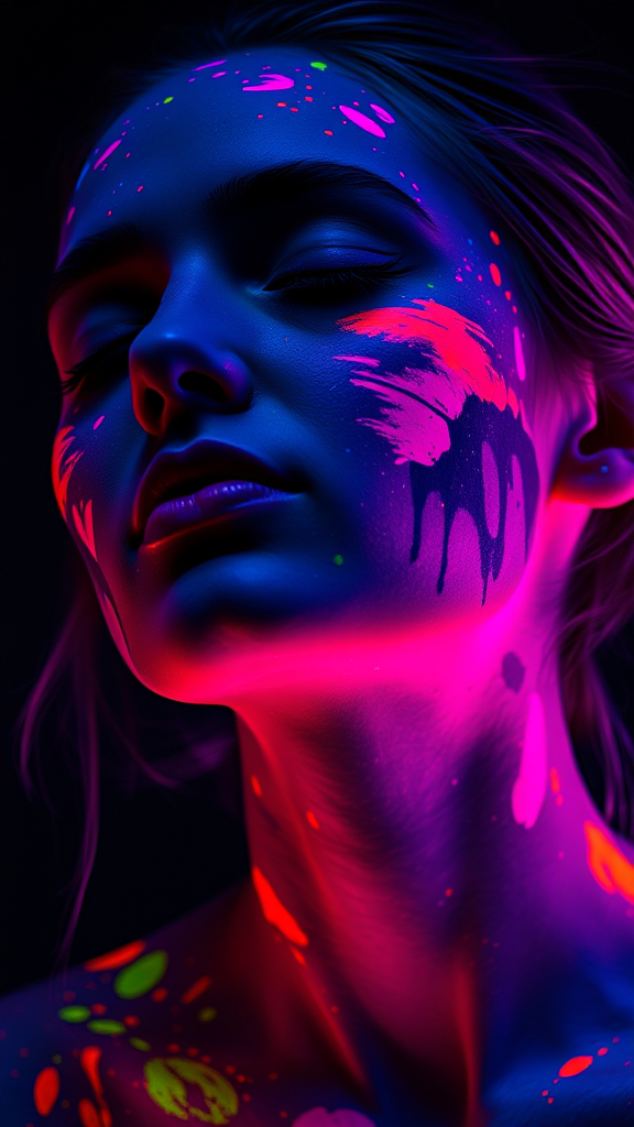 A serene woman with her eyes gently closed is covered in vivid splashes of neon fluorescent paint, glowing brightly under UV blacklight. Her face, neck, and shoulders are adorned with abstract patterns of vibrant pinks, purples, oranges, and blues, creating a mesmerizing play of colors. The dramatic, minimal lighting emphasizes the ethereal glow, highlighting the texture and detail of the paint as it contrasts against a dark, shadowy background. The soft illumination accentuates the contours of her face, enhancing the serene, peaceful expression, and adding an artistic, futuristic touch to the otherworldly scene.