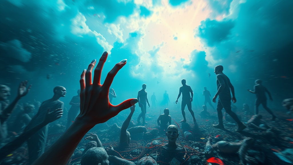 A serene world of stillness where silent minds search for inner clarity; nature resides within, battling inner demons in a scene of vibrant volumetric lighting and atmosphere. Inspired by the style of Bastien Lecouffe-Deharme, the artwork is depicted in high-resolution 4k with a dazzling and dynamic palette. Amongst this chaos, strange and distorted figures emerge—mutated hands with extra fingers, disproportionate limbs, and blurred outlines. Clashing colors and odd shapes create a sense of unease, reminiscent of a poorly executed 3D render or a video game glitch. The scene is filled with wildly inaccurate anatomy and unsettling proportions, presenting a world where reality and imagination collide in a haunting yet mesmerizing spectacle.