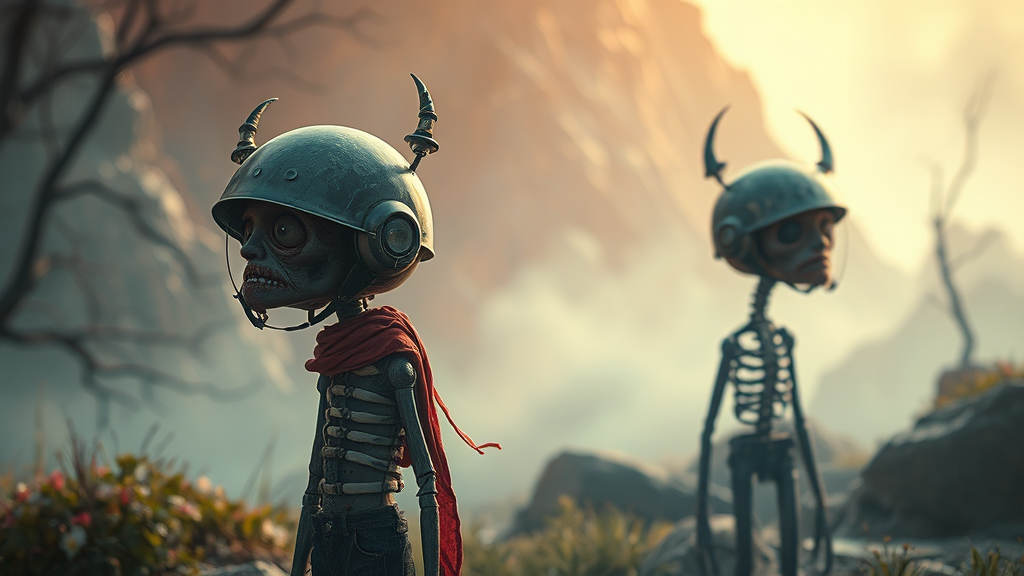A serene world of stillness where silent minds seek clarity, exploring the nature within us amidst an ethereal landscape. A juxtaposition of beauty and the demonic, with volumetric lighting casting a mystical atmosphere. The scene has a touch of vibrant artistry akin to Bastien Lecouffe-Deharme, yet with a twist of unconventional creativity—distorted shapes, unusual colors, and mutated forms. Figures adorned with helmets and disfigured features blur into the background, portrayed in a 4k high-resolution image. This artwork features an eccentric mix of cartoonish elements, misplaced limbs, and bizarre anatomy, all enveloped in a dreamlike haze. A playful nod to flawed artistry with odd proportions, cross-eyed visages, and cloned faces, emerging from the canvas as a video game render.
