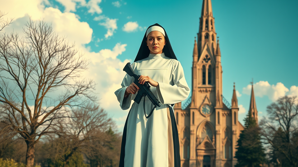 A serene yet striking portrayal of a graceful nun standing confidently with a formidable machine gun, set against the majestic backdrop of a towering cathedral. The scene unfolds in a breathtaking outdoor setting, imbued with an ethereal fantasy atmosphere. The visual style draws inspiration from Die Brücke and surrealism, creating dreamlike imagery that captivates the imagination. The composition captures a sense of awe and intrigue, combining elements of peace and power in a harmonious blend.