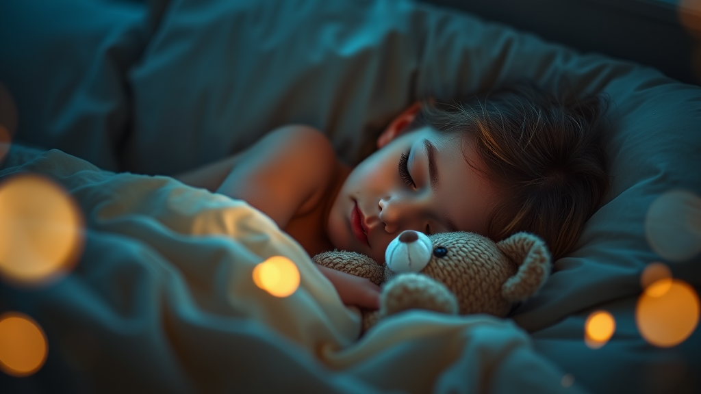 A serene young girl is peacefully sleeping in her bed, surrounded by an aura of warmth and comfort. Her full body is gently nestled against plush, luxurious fabrics, with a beloved teddy bear tucked under her arm. The scene is rendered in a beautiful bokeh style, where enchanting lighting dances softly around her, casting a serene glow in shades of deep navy and light azure. The composition captures a high dynamic range, as if seen through a Zeiss Batis 18mm f/2.8 lens, offering a detailed side view that highlights her tranquil innocence amidst the dreamy ambiance.