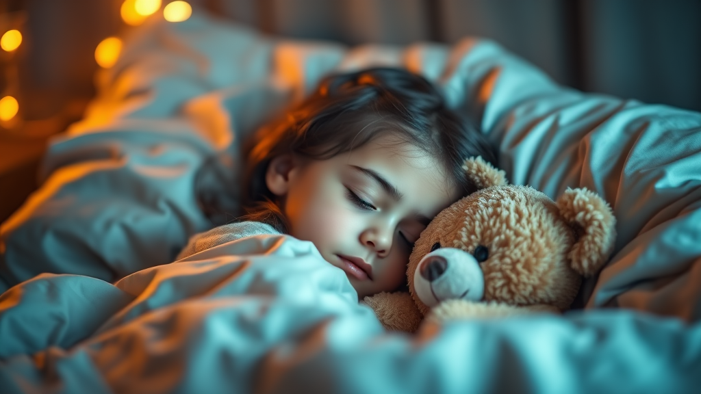 A serene young girl peacefully sleeps in a cozy bed, enveloped in luxurious fabrics. Her gentle face is softly illuminated by enchanting lighting, casting a warm, dreamy glow across the scene. The atmosphere is rich with a bokeh effect, blending navy and light azure hues that create a soothing backdrop. Nestled beside her is a cherished teddy bear, completing this tranquil portrait. Captured with a high dynamic range through a Zeiss Batis 18mm f/2.8 lens, the side view composition emphasizes the calm and innocence of this tender moment.