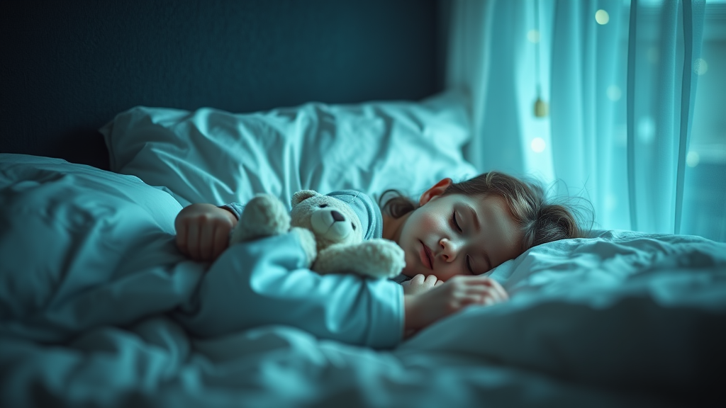 A serene young girl peacefully sleeps in her cozy bed, her full body enveloped in luxurious, soft fabrics. The room is softly illuminated with enchanting lighting, casting delicate bokeh effects in shades of navy and light azure. Her favorite teddy bear is cuddled close, adding a comforting presence to the scene. The image captures a side view, featuring high dynamic range and the sharp, crystal-clear quality reminiscent of a Zeiss Batis 18mm f/2.8 lens. A gentle breeze wafts through, rustling the cotton curtains and creating a sense of tranquility and warmth.