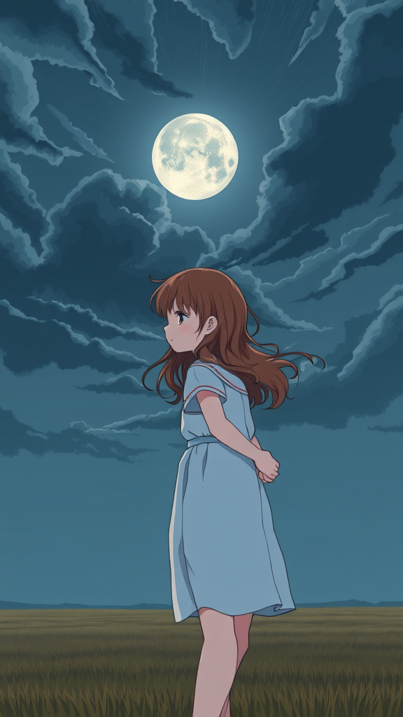 A serene young girl stands alone on a vast, moonlit plain, her delicate features illuminated by the soft, blue-gray light of the summer night sky. Her artist, Oyari Ashito, captures her essence through intricately detailed, manga-inspired graphics, replete with bold lines and vibrant colors. The girl's hand gently rests against her hip, her fingers interlaced in a loose, carefree gesture, as if frozen in the midst of a wistful thought. Her hair, a cascade of flowing, chestnut locks, dances in the gentle breeze, a subtle contrast to the stillness surrounding her. The sky above, a magnificent display of dark, wispy clouds, frames her calm demeanor, their peaks and valleys silhouetted against the starry expanse like a majestic, ethereal canvas.