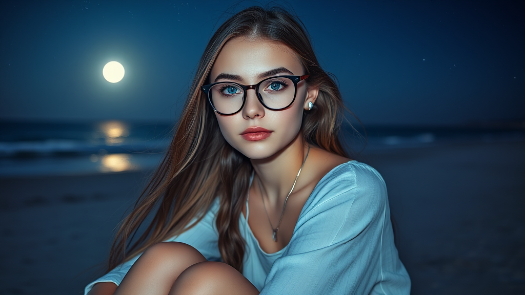 A serene young woman with long flowing hair and striking blue eyes sits gracefully on the beach, her glasses reflecting the gentle moonlight of a starry night. She wears airpods, immersed in her quiet world, exuding elegance with her symmetrical features and calm demeanor. Captured in a full-body portrait, the scene is rich in hyper detail, with glowing colors and natural lighting crafting a breathtaking composition. The intricate design and detailed landscape create a vision of the highest quality; depth of field and a wide-angle perspective enhance the immersive experience. The photograph, enhanced with 16k resolution and RTX ray tracing lighting, presents a harmonious blend of beauty and tranquility.