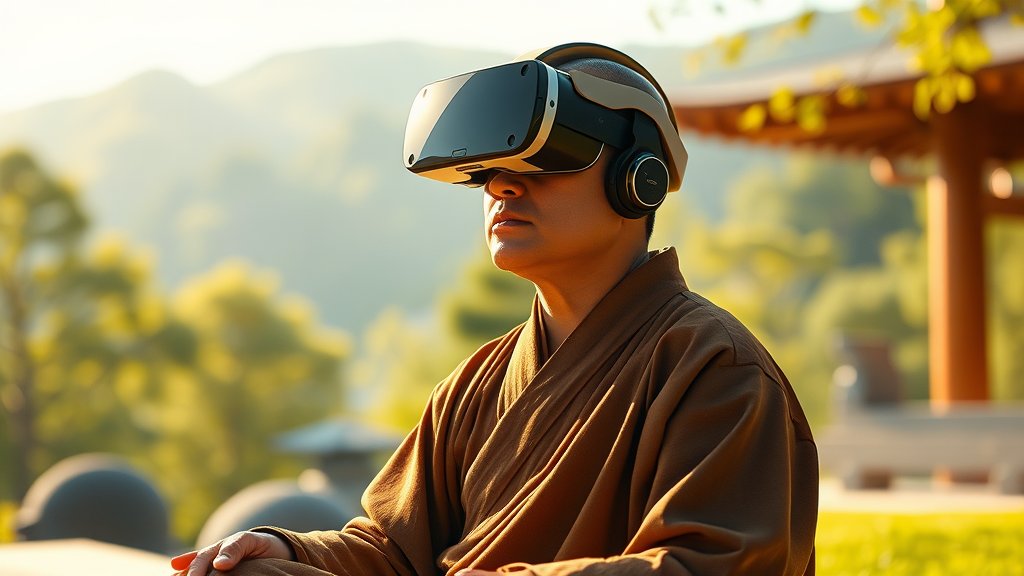 A serene zen monk immersed in meditation, wearing a VR headset paired with traditional zen robes, seated in a bright, sunlit outdoor setting. The scene is rendered in exquisite 8k resolution, resembling a photo-realistic oil painting. This masterpiece blends the detailed artistry of Greg Rutowski, Yoshitoshi, and the enchanting style of Studio Ghibli. The composition features dramatic cinematic lighting, emphasizing the harmony between advanced technology and ancient practice. The painting, although inspired by this fusion of styles, maintains a distinct and unique identity.