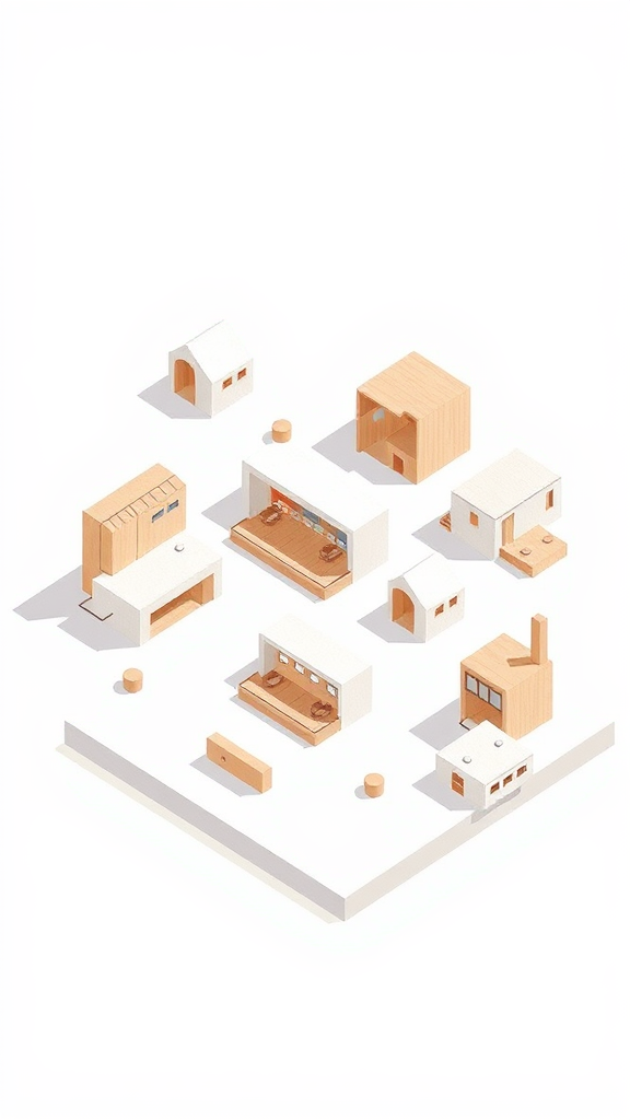 A series of isometric illustrations depicted with delicate brushstrokes on a white backdrop, featuring minimalistic color palettes, showcasing an ensemble of spatial forms with subtle shadows and gentle hues.