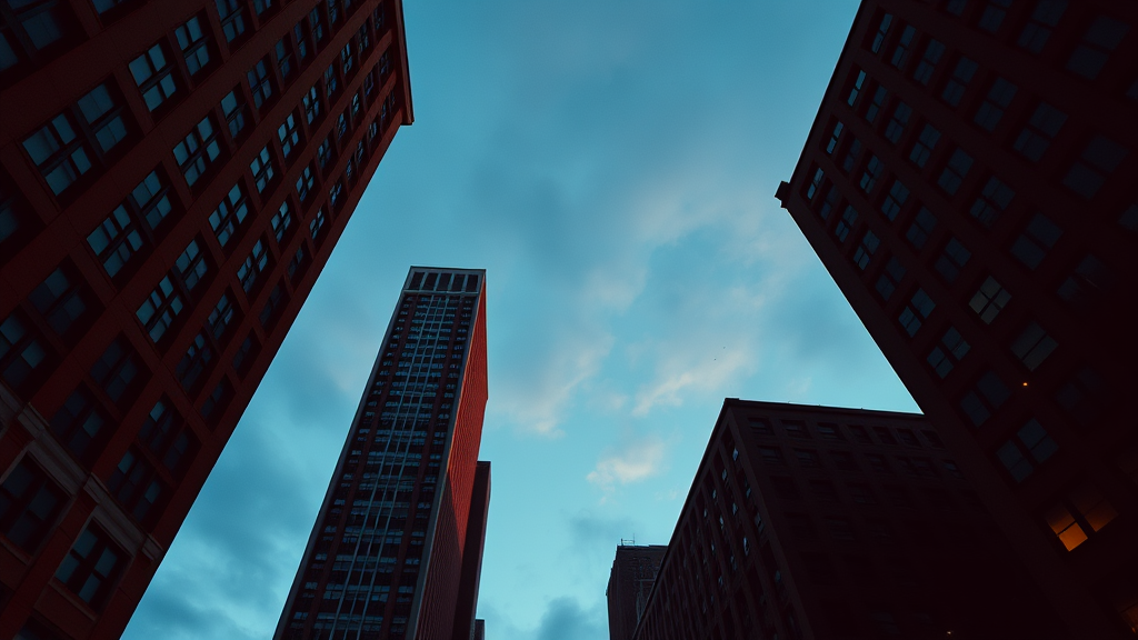 A series of tall buildings reach up into a dimly lit sky, captured from dramatic perspective angles reminiscent of the American Barbizon School. The scene is painted with hues of light maroon and sky-blue, evoking the raw authenticity of street photography. Inspired by Asher Brown Durand's style, the image boasts a 32k ultra-high-definition clarity and a yankeecore vibe, bringing a gritty yet beautiful realism to the composition. The aspect ratio is elongated at 9:16, emphasizing the towering nature of the structures, while the scene is suffused with a subtle intensity.