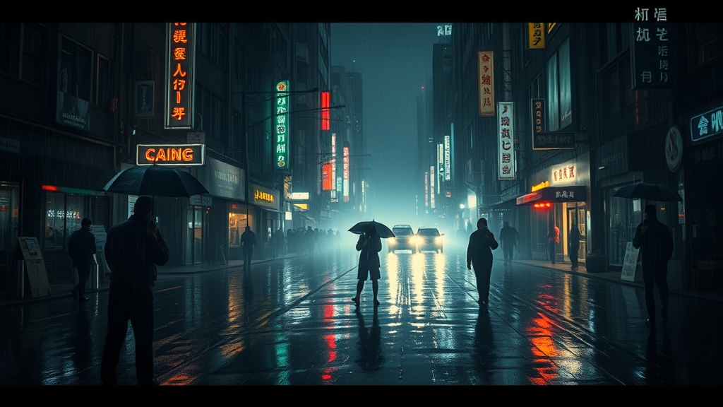 A shadow-cloaked metropolis, enveloped in a relentless downpour, its streets shimmering with reflections of neon lights, casting an eerie glow on the slick pavement as figures huddle under umbrellas, seeking refuge in the dimly lit alleyways.