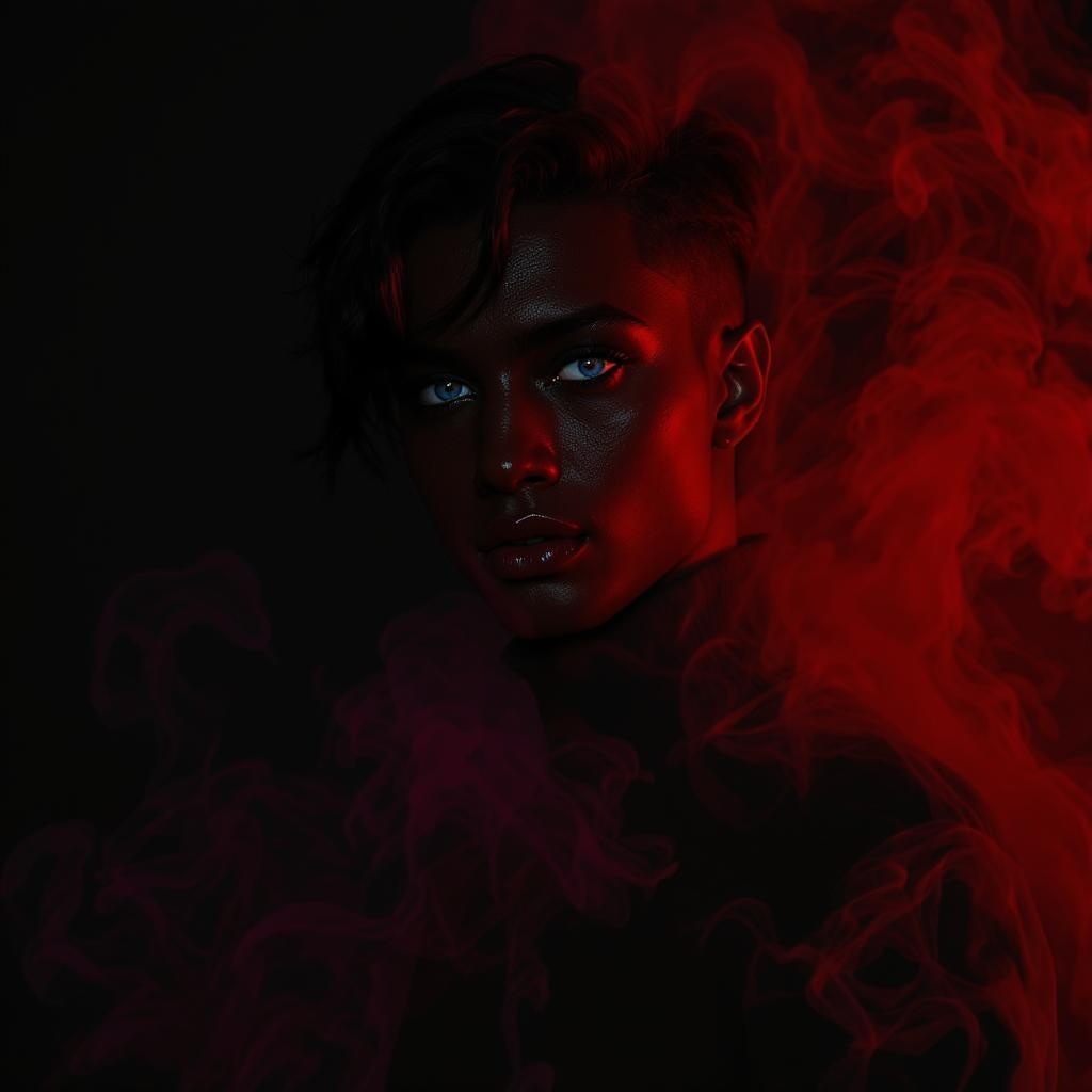 A shadowed model set against a background that transitions from deep black to a vibrant crimson, featuring key lighting with soft diffusion and a warm ruby gel backlight. The scene captures a modern photoshoot with a slightly tilted head and a confident gaze piercing directly into the lens, showcasing a poised posture. The model wears a high-neck shirt enveloped in an ethereal mist, creating a surreal ambiance with diffused shadows in low light. Enhanced tonal adjustments bring the portrait to life, with targeted lightening and darkening to emphasize features. A textured grain overlay adds depth, focusing on the chest and head. The professional model, exuding ancient Greek allure with dark features and mesmerizing heterochromia—one eye a striking blue, the other a deep brown—is photographed using a red camera for a cinematic, sharply detailed finish.