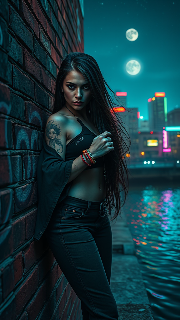 A shadowy cyberpunk woman with long, flowed hair and a scowl on her symmetrical face leans against a worn brick wall, set against the backdrop of a neon-drenched cityscape at night. Vibrant city lights reflect off her numerous rings and piercings as her reflective eyes seem to hold a mixture of defiance and intrigue. She wears a pair of long, fitted sleeves adorned with colorful bracelets, her outfit ending in a pair of scuffed muddy boots. Graffiti covers the wall behind her, the colors bleeding and blending together in a vibrant display of urban expression. The night sky above is filled with the soft glow of distant stars and the pale light of the moon, which provides an ethereal contrast to the stark, urban environment below. A detailed face tattoo appears on her left cheek, its intricate design shimmering with extra moisture, emphasizing its emotive depth. Ahead of her, a body of water – perhaps a river or lake – stretches out, with ripples causing a discordant mix of blues and greens to collide against the dark wall, each imbuing the figure of the woman with an atmosphere. The painting's lighting leans toward chiaroscuro, creating deep shadows that make the contours of her features and edges seem deeper, yet surprisingly without the gruesome horror of mutation. Extra limbs or unusual features are carefully avoided, conveying a strong sense of realistic and precise detail in the formation of this visual splendor. As is characteristic of some of the most exceptional works in the medium, even here there exists a certain amount of the artist's quietly gifted work upon the viewer, amply leaving room for interpretation and imagination beyond the fixed representation of physical body.