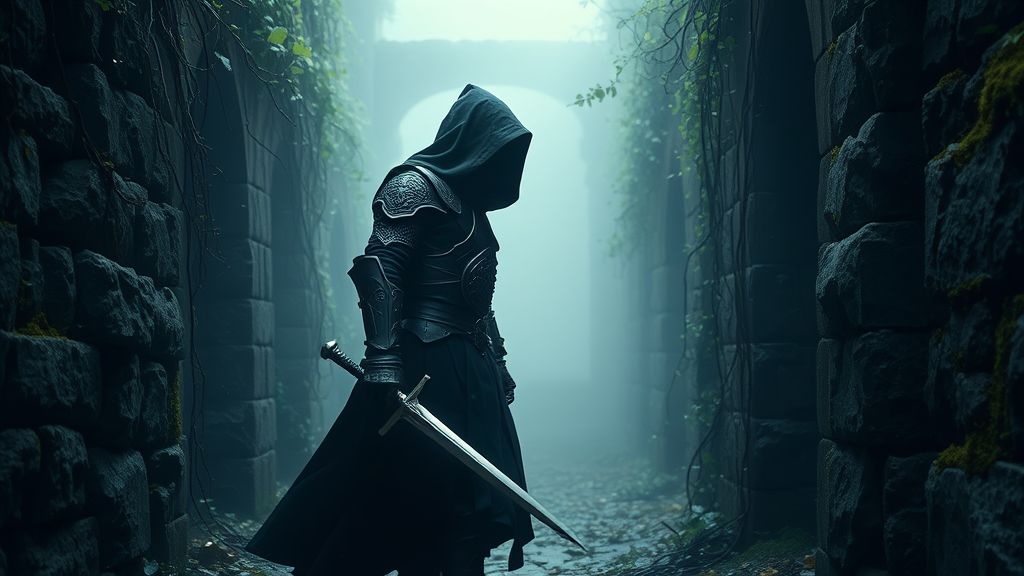 A shadowy figure clad in intricate dark armor and a hood strides purposefully through an ancient, overgrown stone corridor, a gleaming sword in hand. The air is thick with mist, casting an enigmatic and mystical aura over the setting, as tendrils of ivy and moss cling to the weathered stones, hinting at tales long forgotten in the depths of time.