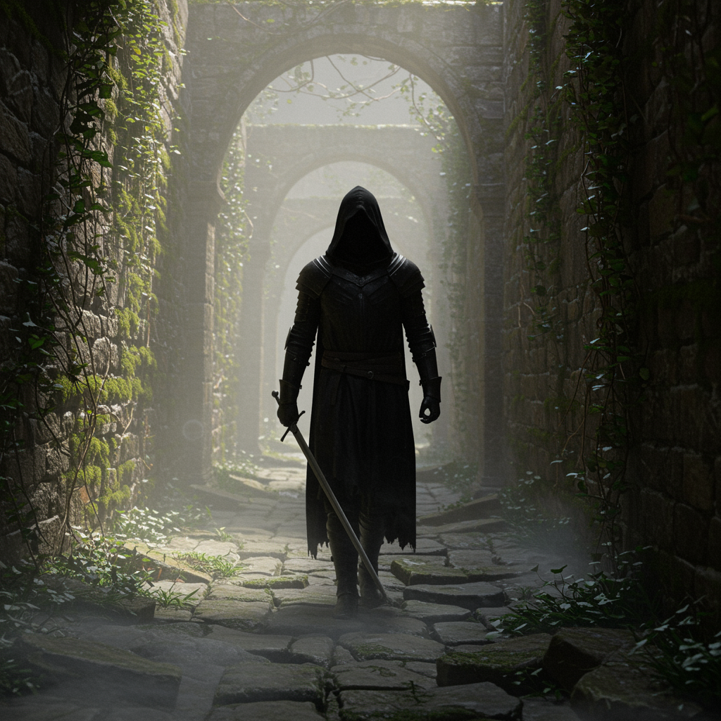 A shadowy figure cloaked in dark armor, their hood drawn low over their eyes, strides purposefully through an ancient moss-covered stone corridor. A glinting sword is grasped firmly in their hand, reflecting the dappled sunlight filtering through overgrown vines that drape the weathered walls. The air is thick with mist, lending an ethereal and mystical aura to the scene. Swirling fog at their feet masks the stones of the path, creating an atmosphere rich with mystery and timelessness.