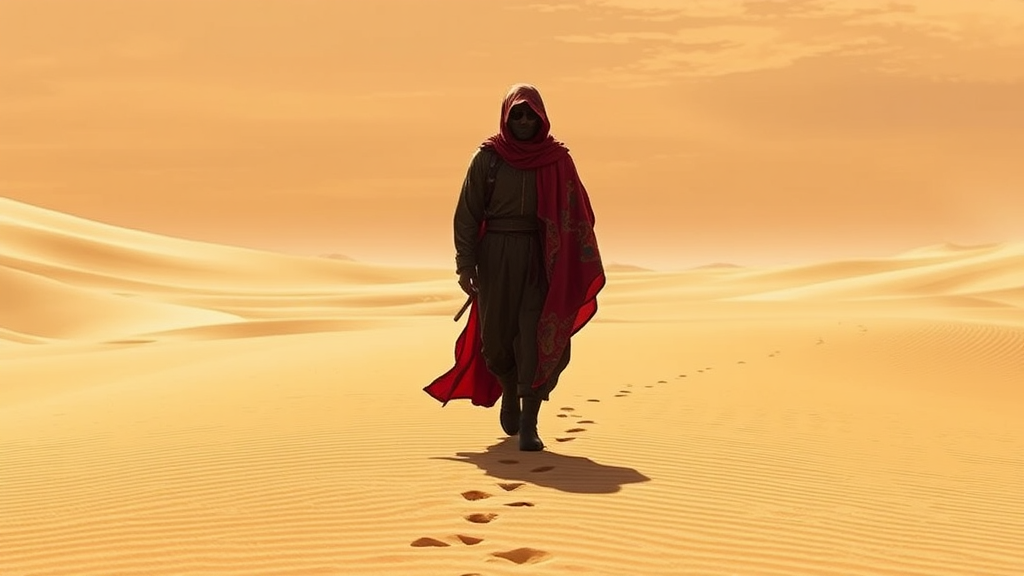 A shadowy figure in a vibrant cloak strides confidently across the vast, sun-drenched desert, their silhouette blurring into waves of shimmering heat, footprints vanishing as the wind whispers secrets of distant lands.