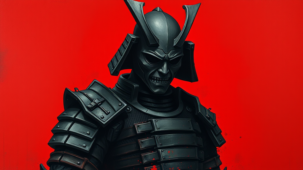 A shadowy, formidable figure stands starkly against a vivid crimson background, their silhouette partially obscured by darkness. This figure is clad in armor reminiscent of samurai design, with visible segmented plates adorning the shoulder and upper arm. Dominating the visage is a grotesque mask featuring small horns or protrusions, its hollow eye sockets suggesting an eerie, otherworldly aura. Rendered in deep grays and blacks, the mask and armor stand in sharp contrast to the vibrant red backdrop. The painting, possibly executed in acrylic or gouache on a textured surface, showcases distinct brushstrokes, particularly in the red background. The lighting is dramatic, with the crimson providing a stark counterpoint to the ominous figure. The composition is tightly focused on the figure's upper body, enhancing the sense of a commanding, enigmatic presence.