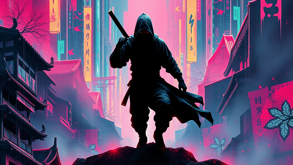 A shadowy ninja, inspired by the vibrant energy of Takeshi Murata, stands poised in a dramatic vertical composition. The figure blends seamlessly into a surreal, neon-infused landscape where traditional elements meet modern abstract art. Their movements are fluid, almost glitch-like, as if they are phasing through dimensions. The scene is brought to life with an exaggerated stylization that emphasizes bold colors and dynamic contrasts, capturing the essence of stealth and agility in a visually captivating narrative.