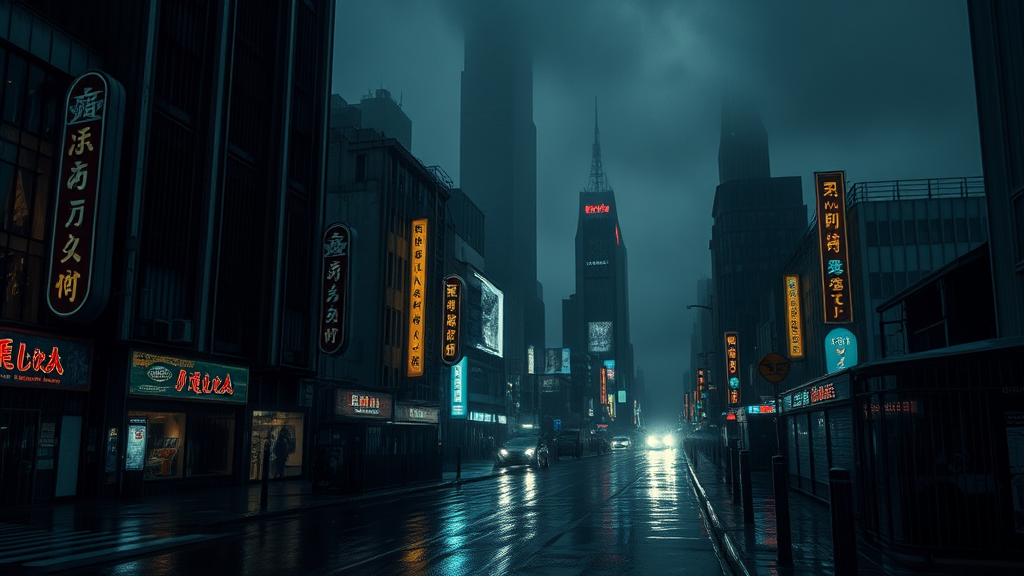 A shadowy, rain-soaked metropolis with glistening streets, dimly lit by flickering neon signs, enveloped in an eerie silence as heavy clouds loom overhead.