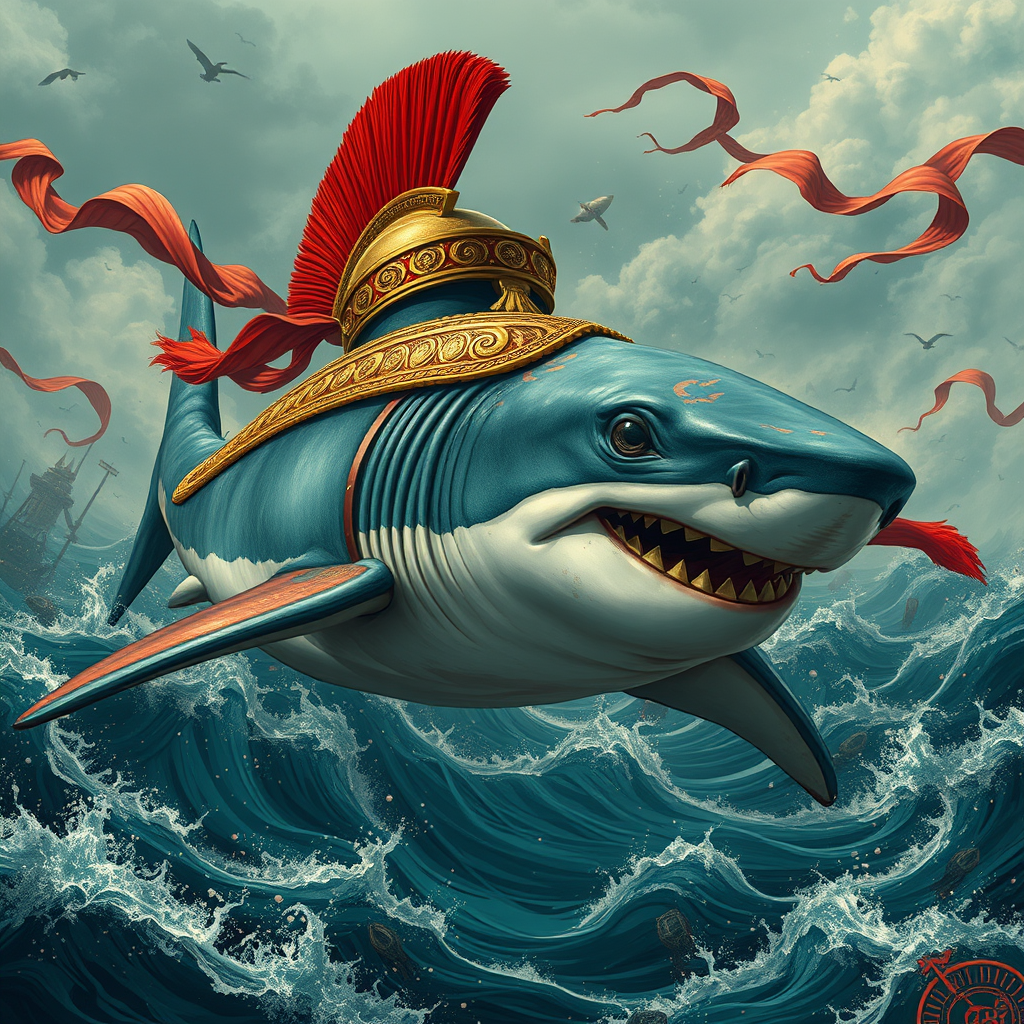 A shark adorned in an ancient, ornate Roman helmet and armor, vivid in bright red and gold, glides gracefully through the tumultuous waters of a war-torn landscape. Its formidable body moves with a powerful elegance, capturing the viewer's eye in a full-body depiction. The scene channels the artistic essence of Xu Beihong and Moosa Al Halyan, rendered with a high level of realism and intricate detail. The image is accentuated by a cyan hue, with flowing arabesque and scroll motifs weaving through the composition. The background is richly detailed, embracing the wimmelbilder style, creating a dynamic and immersive narrative without distracting from the central figure. The overall resolution is 8k, offering breathtaking clarity and depth.