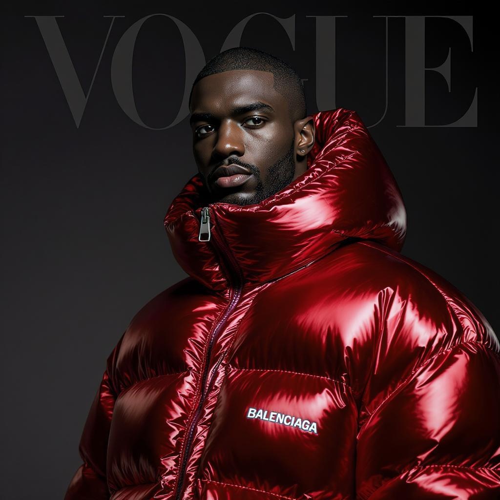 A sharply focused, intricately detailed portrait of a strikingly handsome man in a futuristic metallic crimson inflatable oversized puffer jacket, a unique creation by a collaboration between Yeezy and Balenciaga. The scene is lit with soft, indirect lighting, creating a glamorous cinematic ambiance. This fashion-forward look is captured with a symmetrical composition, echoing the elegance of a high-end Vogue editorial shoot. The setting exudes sophistication and modern flair, reminiscent of a prestigious fashion magazine spread.
