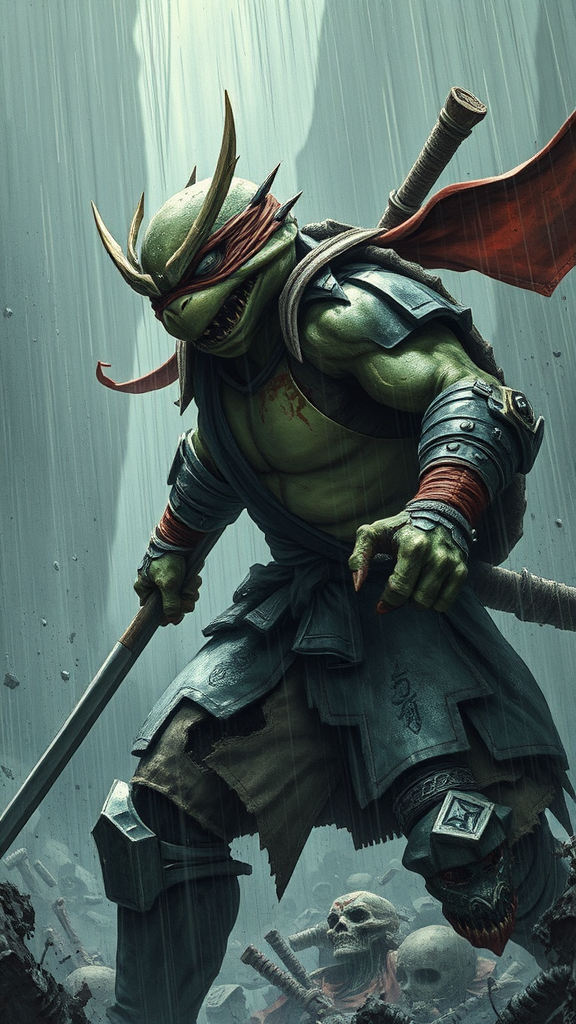 A shattered humanoid ninja turtle engaged in a fierce battle, clad in samurai armor, set in a dark fantasy world with somber tones. The scene is an epic clash, brutal and gloomy, under a relentless downpour. Channeled through the styles of Akira Toriyama, Milo Manara, and Russ Mills, the illustration captures an oblique angle, creating an unforgettable, detailed masterpiece in 8k resolution. The composition is intricate, yet deliberately marred by imperfections—jpeg artifacts, low quality aspects, and a haunting, morbid atmosphere. The figure is grotesquely mutated, with poorly drawn features, blurred lines, and unsettling deformities. Anatomy is distorted with bad proportions, extra limbs, and disfigured traits. Missing or misshaped arms and legs, unnaturally elongated necks, and other anomalies contribute to the eerie aesthetic, while the image is cluttered with marks of imperfection like signatures, watermarks, and other distractions, encapsulating a world of dark fantasy and chaos.