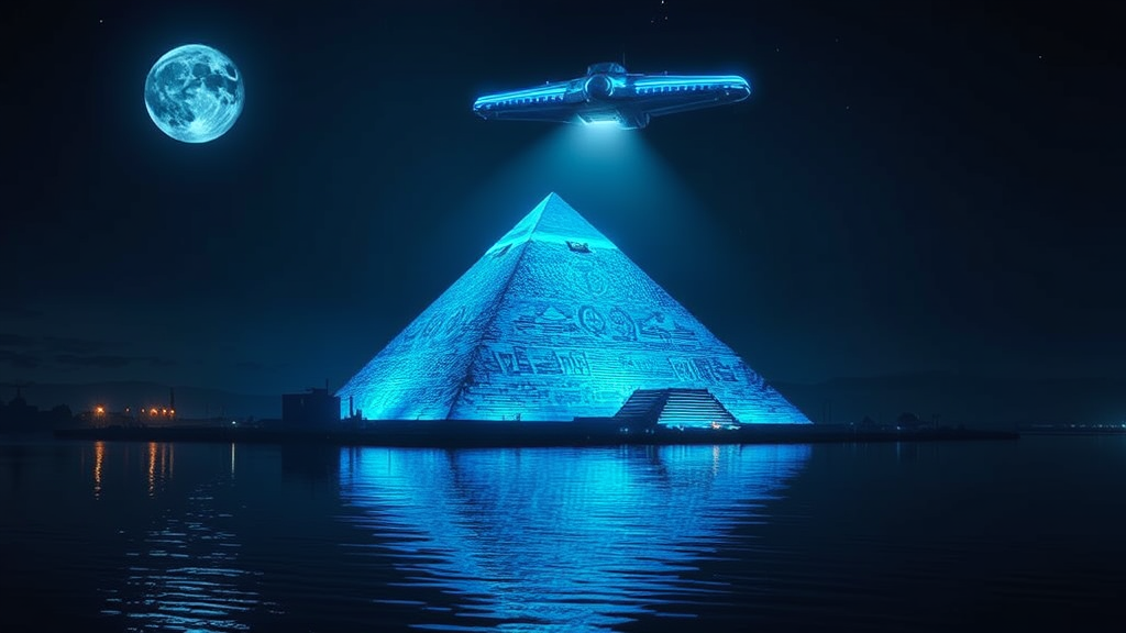 A shimmering blue pyramid rests majestically on the banks of the Nile, its surface glistening under the moonlit sky, casting mesmerizing reflections upon the tranquil waters. Above, an alien spacecraft hovers silently, its luminescent glow casting an otherworldly aura over the landscape, as curious extraterrestrial symbols dance across its hull, echoing the ancient mysteries of the land below.