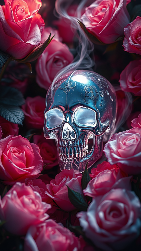 A shimmering crystal skull nestled amidst a bed of blooming roses, exuding an aura of dark enchantment. The setting is suffused with ethereal, magical vibes, reminiscent of a captivating fantasy realm. Illuminated with rich cinematic lighting, the scene evokes an epic mood, perfect for a detailed and ornate wallpaper. Inspired by the intricate and imaginative style of Brian Froud, the artwork is in UHD, HDR, with 8k clarity, highlighting every delicate facet and petal. The skull, with its otherworldly allure, is subtly entwined with wisps of mystical mist, adding a layer of depth and mystery to this vivid fantasy art piece.