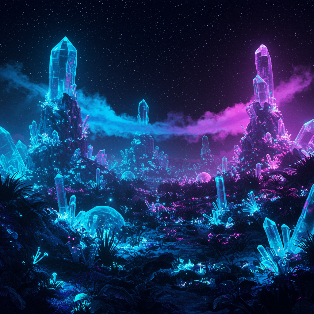 A shimmering extraterrestrial landscape bathed in vibrant neon hues, with towering crystalline formations aglow in electric blues and purples under a starlit sky, where luminescent flora subtly pulses with life and strange alien creatures move gracefully through the surreal glow of iridescent vapor trails.