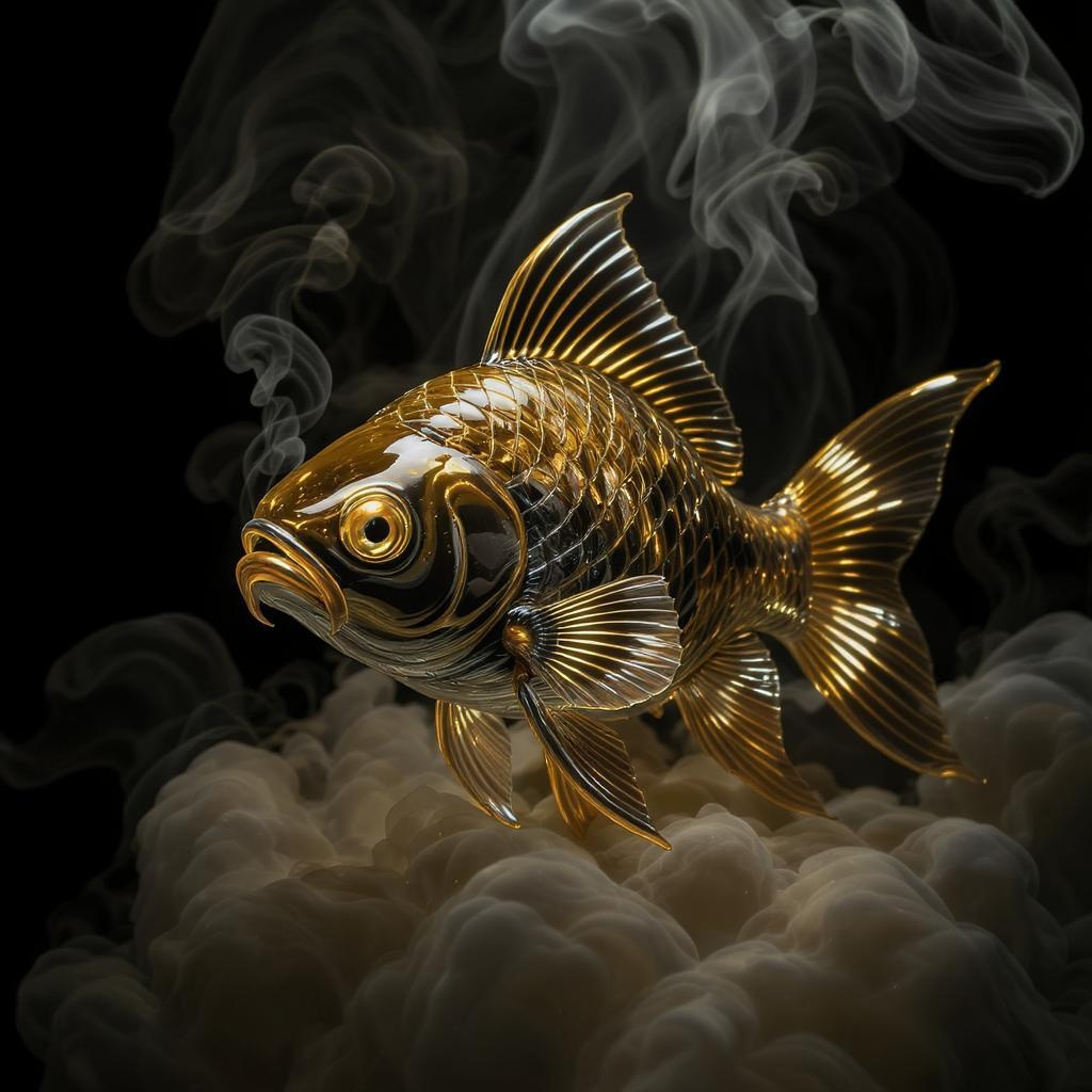 A shimmering glass sculpture of a koi fish, inspired by Hokusai, featuring a lustrous gold and deep ebony color palette. Bathed in cinematic lighting that highlights its intricate details, the fish glimmers amidst swirling volumetric mist, emanating an ethereal and otherworldly presence.