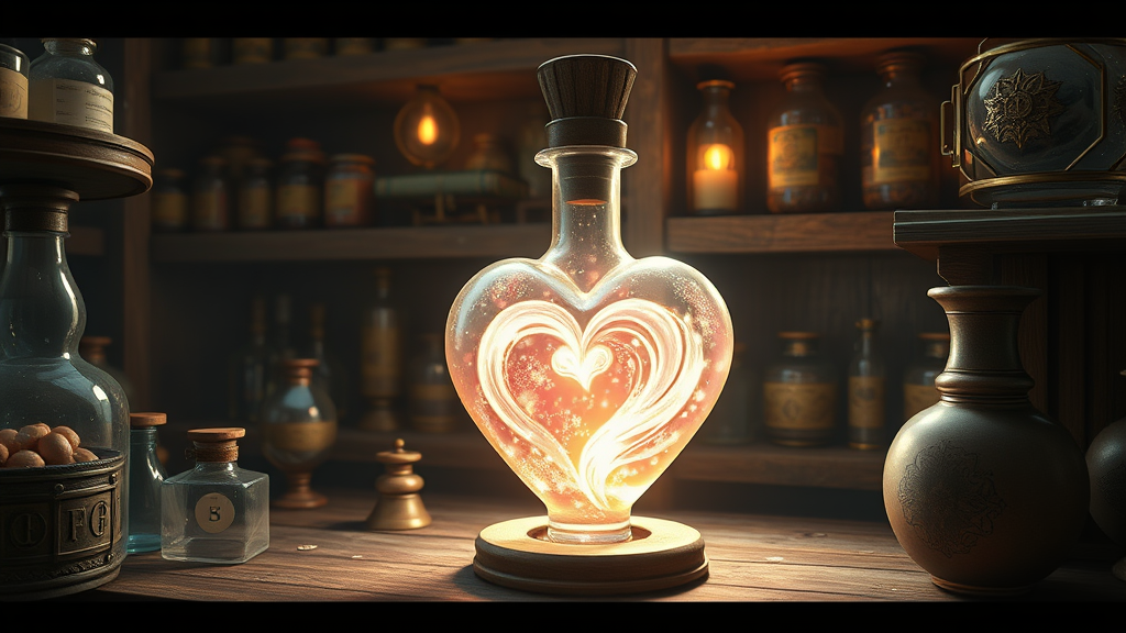 A shimmering love elixir swirls within a delicate heart-shaped flask, nestled amidst the shelves of an ancient apothecary. This enchanting fantasy scene is designed as a videogame asset, capturing the essence of magic and wonder. Rendered in stunning 8k resolution with Cinema4D and Octane Render, the imagery is meticulously detailed, showcasing the intricate, cinematic style reminiscent of Studio Ghibli's art. The old apothecary atmosphere is rich with the aura of potions and arcane secrets, where the play of light and shadow dances across the high-sample, polished surfaces, inviting the viewer into a world of boundless imagination.