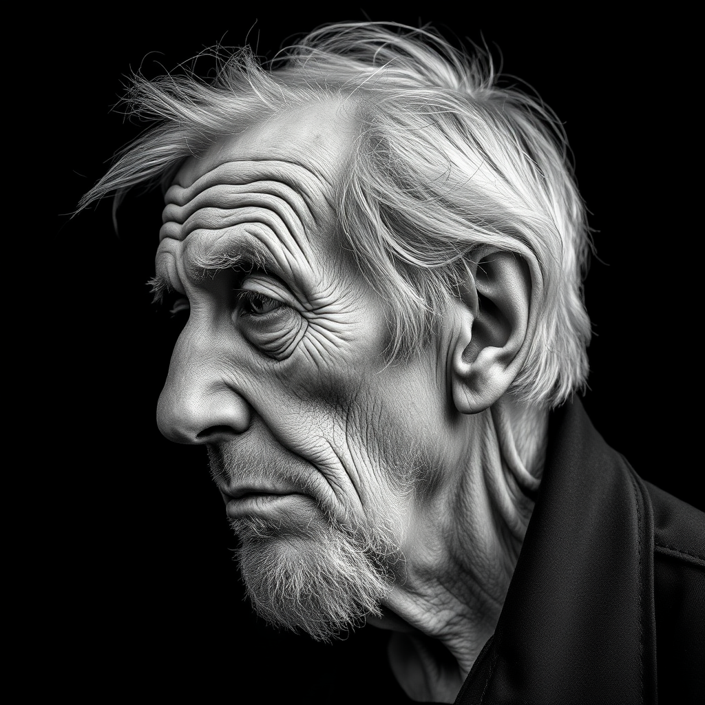 A side profile photograph capturing the essence of an exhausted elderly homeless man, rendered in striking black and white against a stark black backdrop; the image is rich in detail, showcasing a face etched with the wisdom and trials of time. His expression speaks volumes, conveying a blend of sorrow, subtle madness, and life’s deceptions. The scene is captured in ultra-high definition, bringing every line and shadow into focus, telling a silent story of resilience and experience.