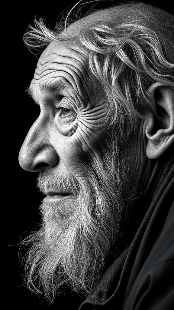 A side profile portrait of a weary elderly homeless man captured with a Mamiya camera in black and white, set against a stark black background. His deeply lined face tells stories of hard-earned wisdom and the relentless passage of time, with nuances of deception, sadness, and a touch of madness etched into his expression. The image reveals the intricate details of his weathered skin, each wrinkle narrating a chapter of his life's journey, captured in ultra-high definition.