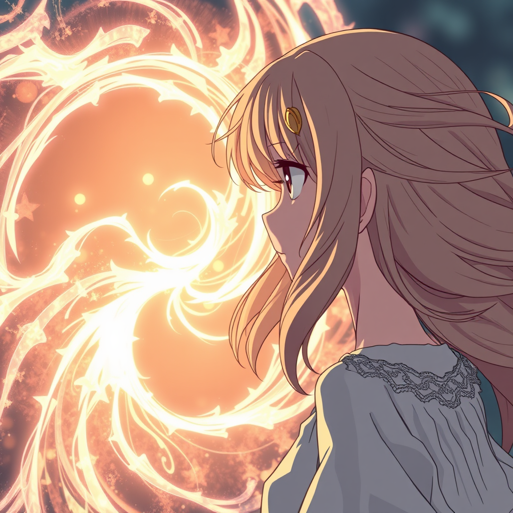 A side view of a female anime-style character with flowing hair, cautiously nearing a luminous, swirling portal that pulses with a magical glow into the real world, depicted in a manga-inspired, photorealistic style, highly detailed and intricate, showcasing an 8k resolution with vibrant colors and delicately textured surfaces, capturing a sense of wonder and adventure, set in an aspect ratio of 3:2.