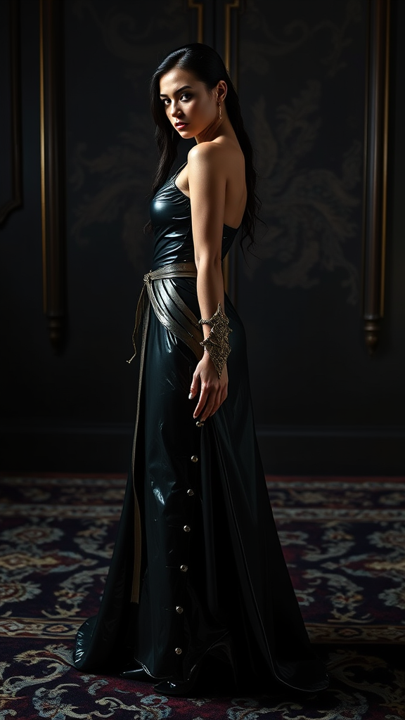 A side-view of an intricately detailed elegant warrior woman with large luminous eyes, posed in full growth, wearing a striking latex dress. She stands on a carpet crafted from leather and silver, captured in a full-body photo that is intricately and meticulously detailed. The dimly lit and ultra-realistic photograph, inspired by the styles of Irving Penn and Annie Leibovitz and retouched with care, showcases hyper-realistic textures and details. Shot with a Leica SL2 camera at f/5.6 using a 105mm lens, the image exudes an air of artistry and sophistication, emphasizing the powerful presence and graceful poise of the warrior woman, surrounded by an aura of mystique and strength.