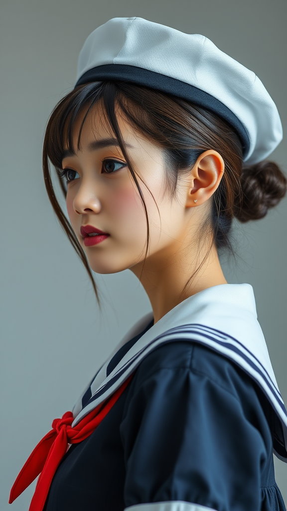 A side view portrait of a lovely Japanese college student, featuring a classic school uniform and a traditional sailor cap, presenting a natural beauty without makeup. The image captures her with intricate detailing and elegant features, illuminated by photometric lighting that highlights her symmetrical profile. The setting is best quality, ultra high-resolution, capturing her youthful charm and academic grace.