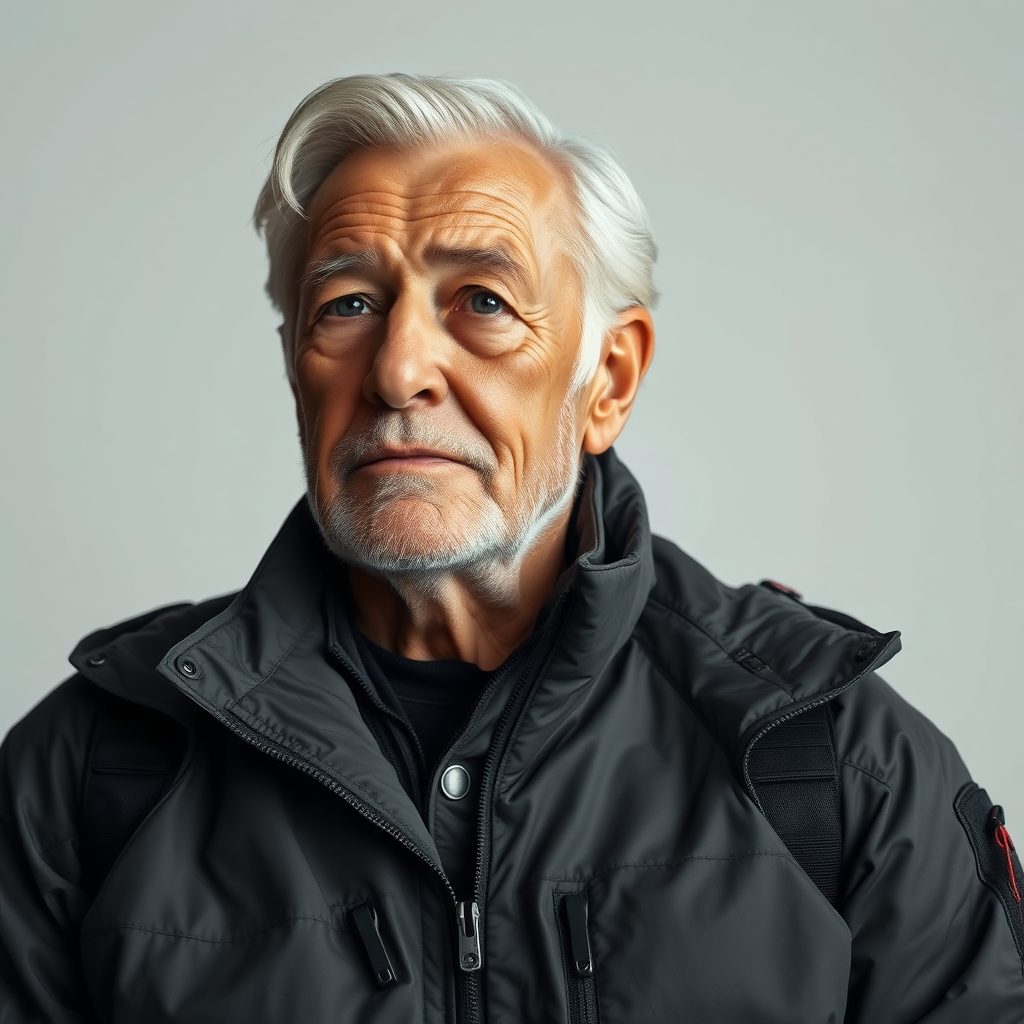 A silver-haired grandfather with a wise and gentle expression, clad in sleek techwear that melds style and utility, captured in ultra-realistic detail. The studio lighting accentuates every wrinkle and texture, highlighting the contrast between his age and the modernity of his attire. The scene carries an aura of calm and sophistication, with negative space used effectively to emphasize the subject, while subtle color grading adds warmth to the otherwise neutral palette. Imperfections in the background are softened, casting the focus solely on the grandfather, as he gazes thoughtfully into the distance, embodying a harmonious blend of tradition and innovation.